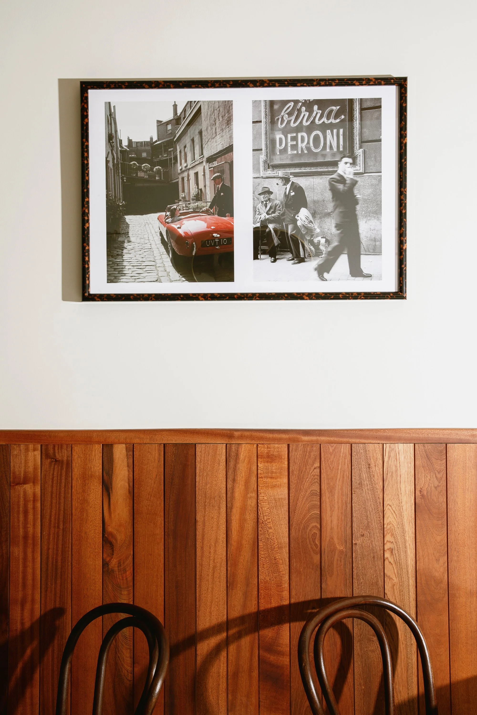 The design is a warm, contemporary spin on a nostalgic diner: glowing mahogany millwork, vintage photos, a rich wave of terrazzo tile, playful hand-painted signs and hand-crafted stained glass.